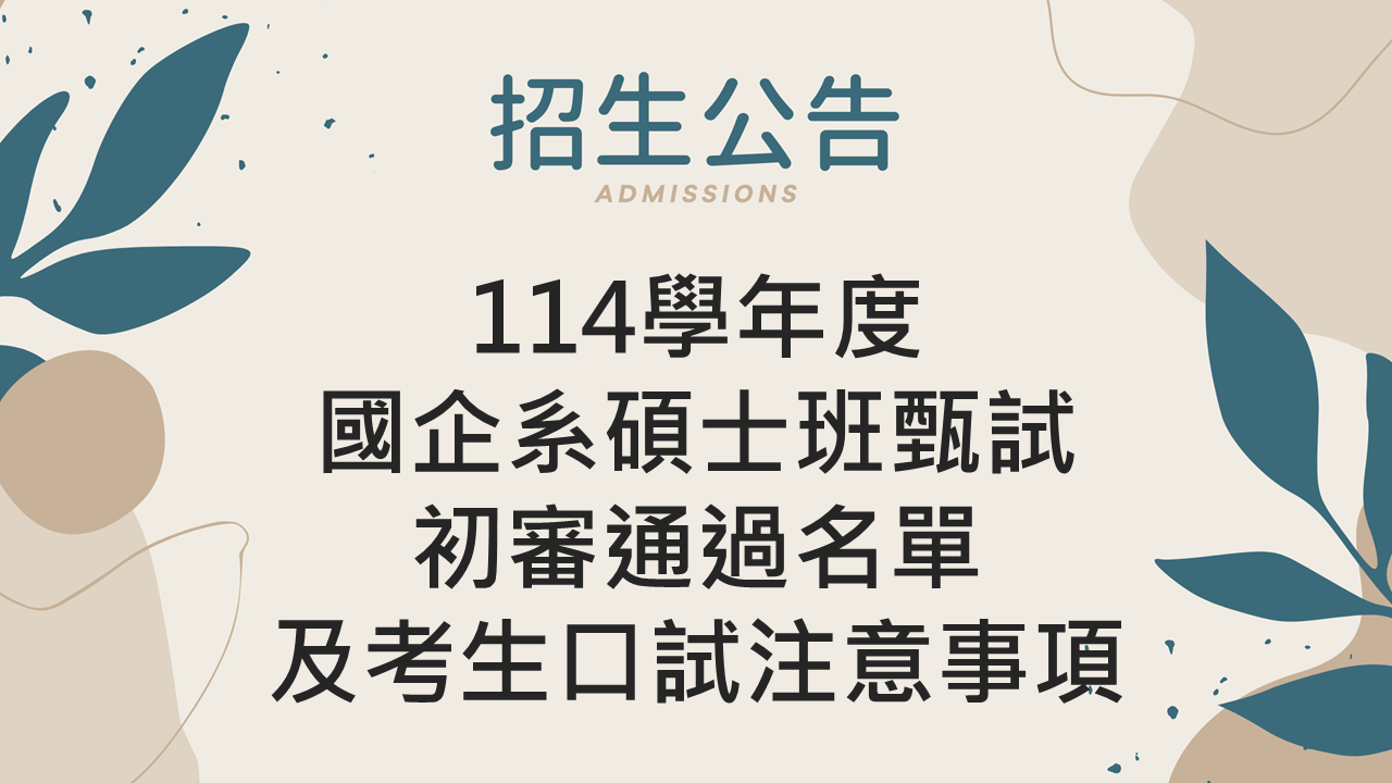 114學年度國企系碩士班甄試初審通過名單及考生口試注意事項