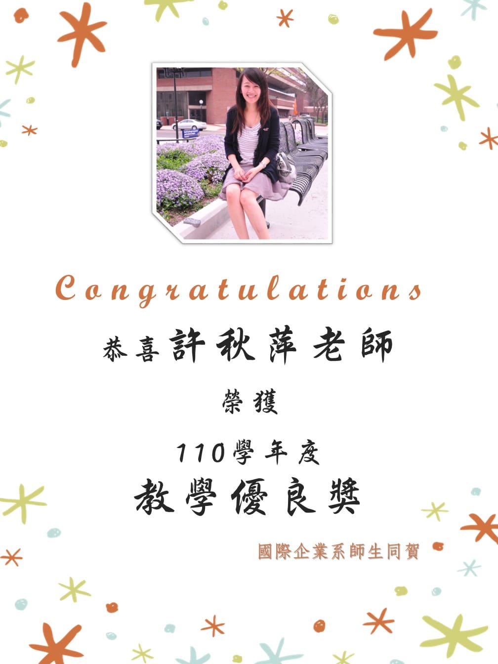恭喜許秋萍老師榮獲110學年度教學優良獎